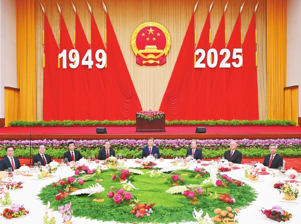 人民大会堂宴会厅华灯璀璨,洋溢着喜庆热烈的节日氛围。主席台上方高悬着庄严的国徽,“1949—2025”大字年号在鲜艳红旗映衬下格外醒目。